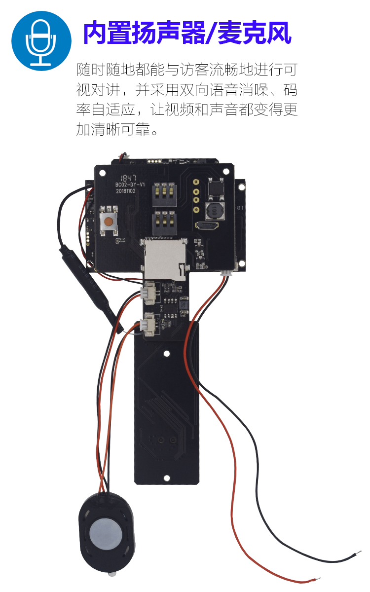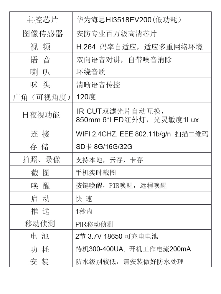 本产品为一款高清WiFi可视门铃。2.4GHZ的工作频率,采用双向连接,远程使用更加轻松。清晰的抓拍图像、准确的灵敏度、超大广角及强大的夜视功能让你随时享受星级安防。超长的待机和超低的能耗使产品更能体现物有所值。安装便捷,设置简单,外观时尚,特别适用于现代家居及宾馆酒店、企业、学校、小型办公区及别墅等场所使用。是智能时代保护先锋!