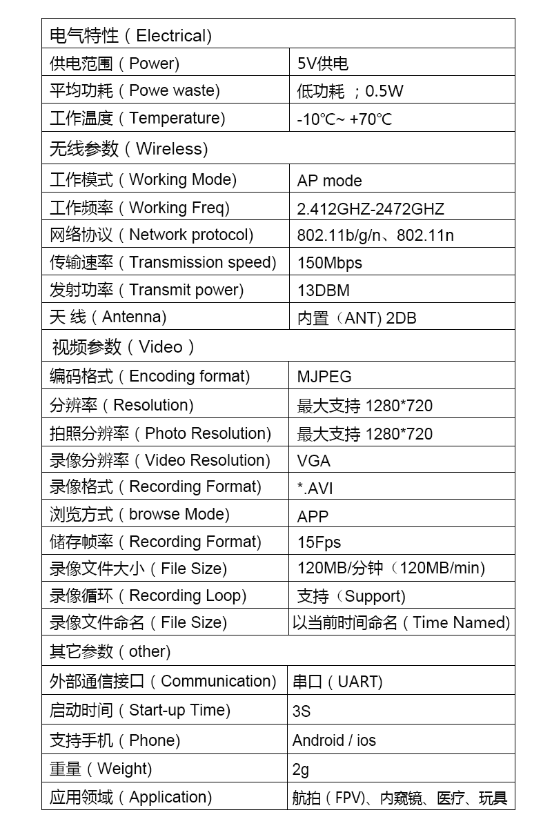 WIFI点对点的方式发送到任意的显示终端(Android、iphone等智能手机或电脑端),由显示终端完成视频实时显示、录像、拍照、数据双向透传等应用功能的处理工作。